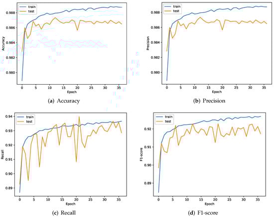Since we are a multiple-binary classification problem, we average the individual metrics across all classes for simplicity. Figure 5 shows the changes of each indicator during the training process of the classification model. From Figure 5, we can see that the accuracy and precision can be stabilized at about 98.6%, indicating that our model can predict the obfuscation technology correctly with high probability. Meanwhile, we see that the recall and f1 values, although not very stable, are still able to stay above 90% after 10 epochs. These four indicators show that our proposed model can achieve a good classification effect after only a small amount of training (about 10 rounds), which reflects the effectiveness of our method.