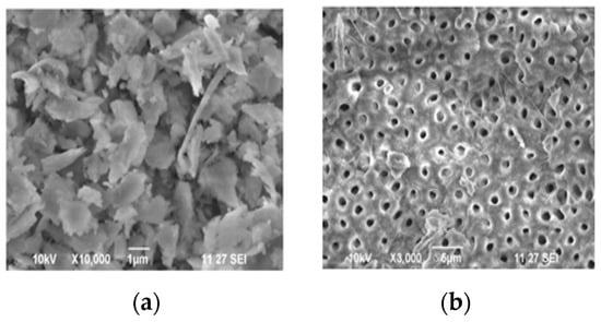 SEM image of the tooth sample after iontophoresis—with pores formed in the gel at 5 µm and 1 µm.