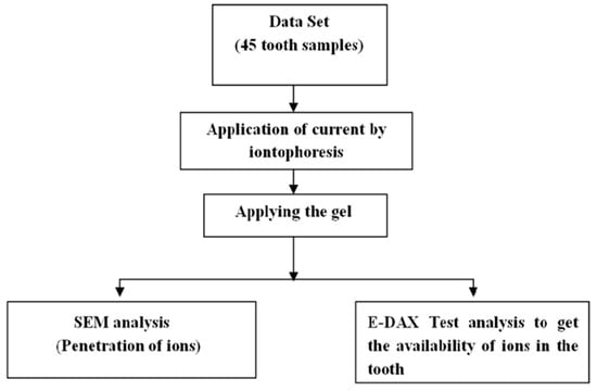 The studies by Krishnaprasad et al. and Shashikanth et al. [] have also reported on a comparison of the efficacy of two different commercially available desensitizing agents and concluded that acidulated sodium fluoride (NaF) gel 0.33% with the iontophoretic procedure obtained better results. Thus, this paper also justifies the desensitization of teeth with the method of iontophoresis, which has been proven by testing various tooth samples. The overall process of the studies taken up in this research paper is pictorially shown in Figure 2.
