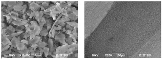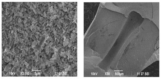 Figure 9 and Figure 10 show the SEM images of the tooth sample after iontophoresis—sectional view at 1 µm and 100 µm and the SEM image of the tooth sample after iontophoresis—with pores formed in the gel at 5 µm and 1 µm, respectively.