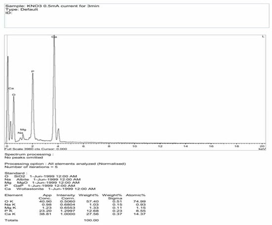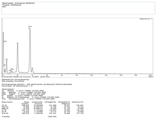 The tooth samples were divided into five groups: potassium nitrate, varnish, lidocaine, and strontium chloride, which are commonly used in the dental process, and one for the control group. Figure 11 and Figure 12 are the EDAX results for the tooth samples with the iontophoresis method and the control group type with the application of KNO3, respectively.