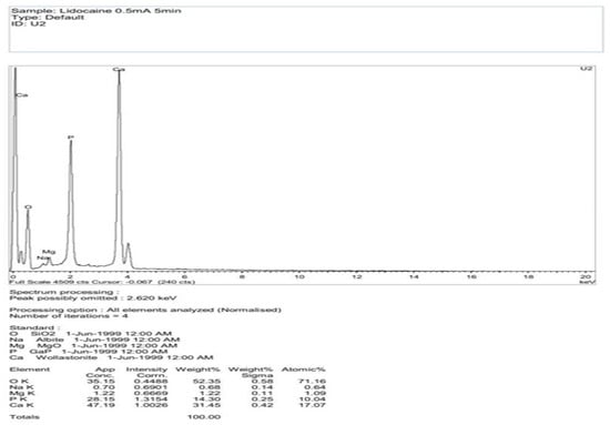 EDAX analysis was conducted for the 0.3 mA current for a duration of 3 min and showed the same results for the 0.5 mA current for 5 min. The presence of sodium ions was 0.87 for the tooth sample treated by iontophoresis, which were not traced for the control group samples with lidocaine. This is because sodium ions (Na) are used in lidocaine gel to balance the pH in the gel. During the iontophoresis method, the Na ion used is exited, which is traced. Thus, Na can be used for desensitization of the tooth.