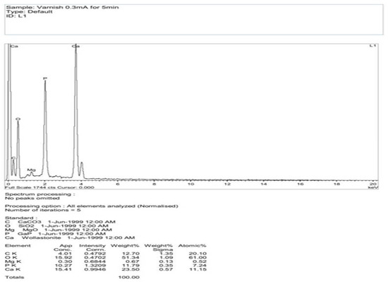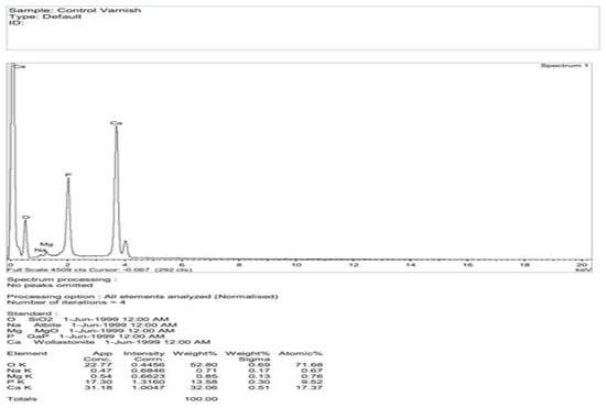 Figure 15 and Figure 16 show the EDAX results for tooth samples with varnish for the control group and the samples tested with iontophoresis, respectively. For the varnish samples, apart from other compounds given in the table, the presence of sodium (Na) ions was 0.67 for the control group and 0.61 for that of the samples treated by iontophoresis for a duration of 5 min with the 0.5 mA current (i.e., 75% of the ions were present in the tooth after the above method).