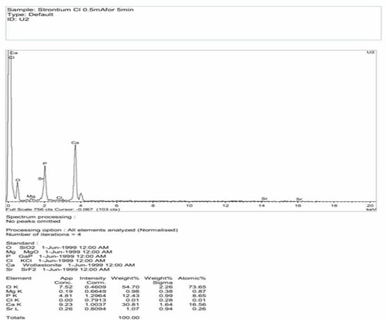 The inference from Figure 17 shows that the samples treated by iontophoresis with strontium chloride contained Sr-0.11 (strontium), Na-0.61 (sodium), and for Cl-0.07 (chloride), which were present in the tooth samples.