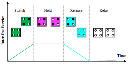 In QCA, clocking plays a substantial part in the proper working of the circuits. It is responsible for the control of data flow in a circuit. In addition to this, it acts as a supply and delivers power to the cells [6,10,14]. The clock is applied in four zones to a circuit in QCA. Each of these zones is represented by a different color. Green is for clock 0, clock 1 is represented by magenta, clock 2 by blue, and clock 3 is represented by white. Each clock zone has four distinct phases, i.e., switch, hold, release, and relax. Figure 4 depicts these different clocking zones in QCA [1,26].