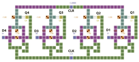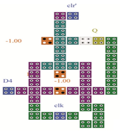 A flip flop is a sequential circuit that has output dependency on its present input and the past output. It is a memory unit that has the capability of storing 1 bit of binary information [6]. For the realization of more complex sequential circuits, flip flops and memory cells act as the characteristic building blocks. This section presents the various D flip flop designs existing in the literature. These designs are discussed in [28,29,30,31]. The drawbacks of these designs were highlighted, and a performance comparison was drawn based on the various performance parameters of QCA. The design discussed in [28] used 59 cells with an area of 0.075 μm2. It showed a delay of 1.75. The design proposed in [29] used 56 cells and had latency of 2.5. Hence the cell count, as well as the latency for this design, were large along with the utilization of more area, which increased overall quantum cost. The D flip flop design proposed in [30] utilized 48 QCA cells but showed a lower latency equal to 0.75. Their design is shown in Figure 5. Further, a four-bit PIPO shift register was designed using this D flip flop design that consisted of 260 cells in its QCA design and showed a latency equal to 1. This shift register design is shown in Figure 6.