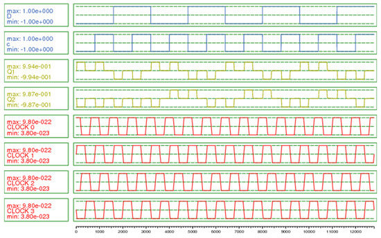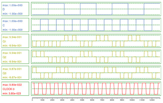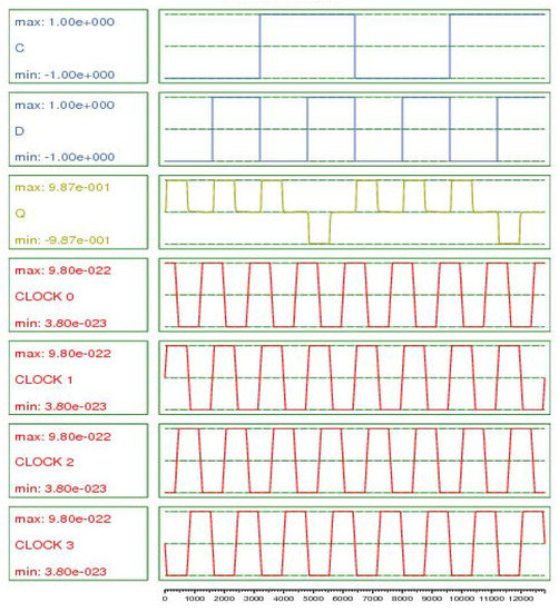 From Equation (1), it is observed that when clock CLK is 1, the output of the flip flop will be equal to the value of input D, and when clock CLK is 0, the output will not change and will be equal to the previous state Qn−1. The proposed design of DFF utilizes 21 cells in QCA implementation and occupies a total area of about 0.04 μm2. It has a latency of 1 and a cell area of 0.0068 μm2. It responds to the positive level of the input clock signal C and implementation of this design in QCA along with its simulated waveform are presented in Figure 8 and Figure 9, respectively. The output Q follows input D with a delay of 1. When clock C is 1, the input sequence is 01, and therefore, output is also 01 for that duration. Then, the output retains its previous value when the clock is 0. Further, when the next clock cycle appears, output again follows the input. The proposed flip flop was designed using the QCA Designer tool [32].