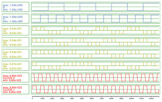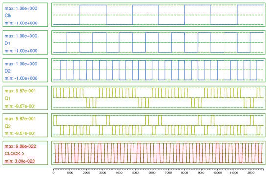 The two-bit PIPO shift register was constructed using two proposed DFFs. The proposed DFF design was used here. It utilized 55 cells in its QCA design. The two parallel inputs were D1 and D2 for stage 1 and stage 2, respectively. CLK is the clock signal applied to the circuit. Q1 and Q2 were two parallel outputs from stages 1 and 2, respectively. Each stage had a latency of 1 because the QCA clock zone changes four phases from respective input to output with a delay of 0.25 for each zone. Figure 11 shows the two-bit PIPO shift register design as employed in QCA, and Figure 12 shows its simulation graph. It can be seen that when the positive level of the clock appears, the outputs start to follow their respective inputs with a delay of 1 for each stage. For the first clock, the input D1 is 0011, and it can be seen that output Q1 reflects the same sequence 01 with the delay. The second input D2 is 0101 for this duration, and output Q2 reflects the same sequence with the delay of 1.
