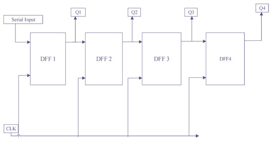 When the input is applied serially and the output is obtained in a parallel manner, the shift register is termed as serial-input-parallel-output. Figure 15 is the block diagram representation of a four-bit SIPO shift register. It can be seen that all the DFF are joined in a cascade manner where serial input is entered to the first DFF at the left and then the output of one connects to the input of the DFF following it. Since the same CLK pulse is applied to each of the DFF, the design is synchronous, and the output of each DFF is occupied in a parallel manner.