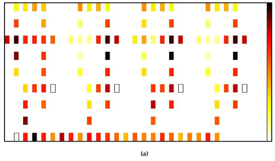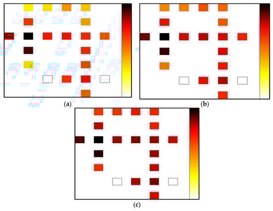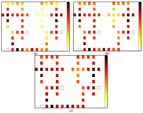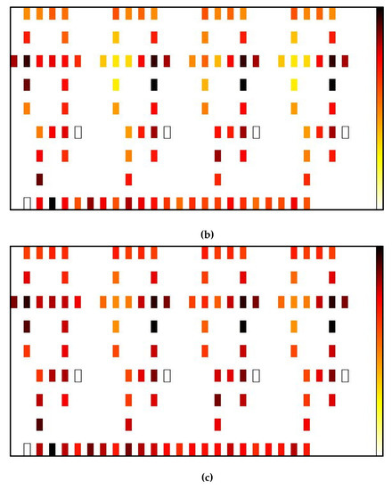 For the purpose of estimation of cells that cause major error i.e., exceedingly erroneous in QCA circuit design, QCAPro, a probabilistic modelling tool [33], was used. This tool uses the fast approximation technique. The tool was used to evaluate the three energies, i.e., the average leakage energy, the average switching energy, as well as the total leakage energy. The analysis was performed at three different tunneling energy levels, 0.5 Ek, 1 Ek, and 1.5 Ek at T = 2K, which is the default operating temperature selected for the energy dissipation analysis of the proposed designs [34,35,36]. The thermal maps for the proposed DFF design at all tunnelling levels, i.e., 0.5EK, 1.0 EK, and 1.5 EK, are shown in Figure 22. The thermal maps for the proposed DFF based 2-bit PIPO shift register at all tunnelling levels, i.e., 0.5 EK, 1.0 EK, and 1.5 EK are shown in Figure 23 and for the DFF based four-bit PIPO shift register are shown in Figure 24. These maps show that cells in dark dissipate more energy than cells lightly mapped. Additionally, these maps can be used to optimize designs to minimize the number of dark cells, thereby reducing overall power dissipation. Table 3, Table 4 and Table 5 show the energies dissipated by proposed DFF, two-bit PIPO, and four-bit PIPO shift registers, respectively.