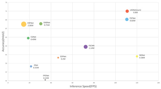 In order to demonstrate the advantages of our network, we selected 11 most advanced lightweight models as comparison networks, including SegNet, ENet, ICNet [45], ESPNet [46], CGNet, ERFNet, DABNet [47], FSCNN [48], FPENet [49], FSFNet, NDNet [50]. The experimental results of some network models are generated using the default parameter settings given by the author, while others are directly reproduced from the published literature. All comparison networks are evaluated and measured by the mean Intersection over Union (mIoU) class score, which is commonly used in the evaluation of semantic segmentation model indicators. mIoU represents the ratio of the intersection and union of the real value to the predicted value. Each class calculates its own IoU as follows: