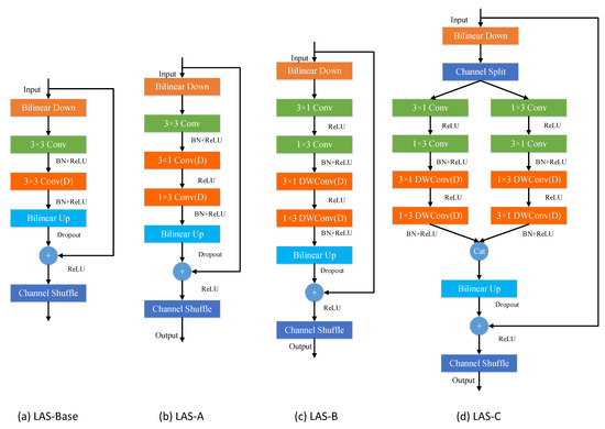 In order to achieve a balance between inference speed and segmentation accuracy, we designed a new module called LAS. Our proposed LAS adopts a residual connection structure, which is to prevent gradient disappearance or gradient explosion by building a high-performance deep network. In order to reduce the computational complexity of convolution, we first adopt downsampling of the feature map in the residual unit to reduce the amount of computation. Then, we use two convolutions to extract the features and upsample the feature map to match the size of the input map. We use bilinear interpolation to upsample and downsample, which is more convenient than convolution. Finally, we use channel shuffle to achieve feature reuse with disrupting channels. We apply asymmetric convolution, group convolution, and dual-stream structure into the residual unit of LAS. There are LAS-A, LAS-B, and LAS-C structures in the LAS module, as shown in Figure 3. Due to this unique design, LASNet has fast inference speed and high accuracy.