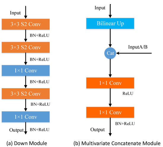 Down sampling module and multivariate concatenate module (S2 conv block denotes a convolution block with a stride of 2).