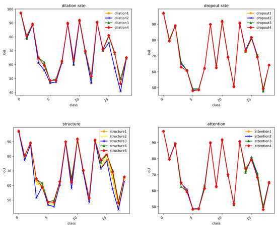 We use the attention mechanism in the transform module to alleviate the contradiction between model complexity and expression ability. With the help of the way the human brain processes information overload, the spatial attention is used as the critical part with greater weight so that the model’s attention can be more focused on this part. In Table 8, we compare four cases in the transform module of LASNet: no-transform module, CBAM, triplet attention, and coordinate attention. Extensive experimental results show that selecting the appropriate attention mechanism is effective. The segmentation accuracy of CityScapes dataset can differ by 0.36%. In particular, the use of triplet attention in the transform module shows the best segmentation performance. This is because the dependency between dimensions is established through rotation operation and residual transformation, which can encode the channel and spatial information. Therefore, triplet attention is more suitable for our architecture. Figure 7 shows the IoU of the CityScapes dataset after segmentation by all ablation studies.