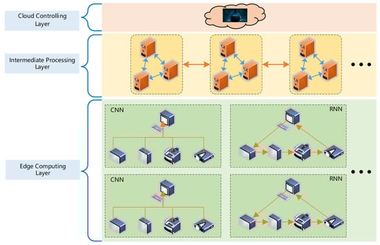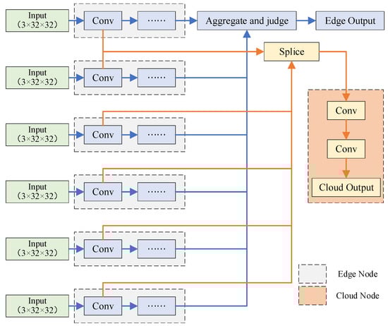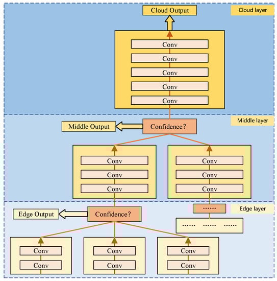 The distributed deployment scheme of the CNN in AIBot after completing the adaptation modification is given below. The distributed nodes are first hierarchically divided into edge nodes, intermediate nodes and cloud nodes according to the device properties, and then the trained neural network models are mapped to the corresponding physical devices. From the edge to the cloud, the computing capability of the device is sequentially enhanced to support deeper neural network operations. As shown in Figure 5, nodes at different levels divide the network into three layers, with the output of the neural network existing at each layer, and the confidence level of the classification result is judged to determine whether to submit the upper layer of the network for further operations.