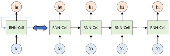 An RNN takes sequence data as input and recurses in the direction of sequence evolution, and all recurrent units are connected in a chain-like manner. LSTM [], as a type of recurrent neural network, solves the long-term dependency problem in general RNN networks through a conveyor belt mechanism and performs well in natural language processing problems, such as text generation. As shown in Figure 6, a recurrent neural network can be regarded as a chain computational network with each identical computational unit cyclically connected in series, and the output of the previous computational unit serves as the input of the next computational unit. In this paper, the repetitive computation units in RNN are represented as cells, and the parameters in the cells are uniquely determined after the neural network has completed being trained. Another major feature of RNN is sequential input and output: the first n − 1 data points are sequentially serialized input and, after performing forward computation, the nth data point is inferred from the output result. The above analysis shows that an RNN cannot perform distributed parallel computation in the traditional sense but, based on the characteristics of its recurrent computation structure, it can distribute the overall computation quantity to multiple nodes and reduce the computation quantities of individual nodes, thus adapting to the needs of botnets.