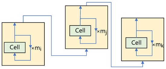 For distributed deployment of RNNs, the central idea is to distribute the computation according to the performance of the nodes; i.e., high-performance nodes take up more cycles of computation and low-performance nodes take up fewer cycles of computation. Figure 7 illustrates the distributed deployment scheme of an RNN with three nodes as an example: the nodes are written as i, j and k in order, and the operations are performed from node i, nodes j and k perform subsequent operations in turn and each node performs mi, mj and mk cycles of computation respectively; the node performance is written as P. Then, the relationship between the node performance and the quantity of computation (in terms of the number of cycles) satisfies Equation (14):