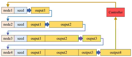 Compared with CNNs, the decomposition and deployment of tRNN neural networks are more concise. However, the special serialized input and one-by-one generated output of RNNs need to be discussed and analyzed in the context of the distributed environment characteristics of botnets. When a trained RNN model performs computational tasks such as text generation, it needs an initial input, called the seed. The seed in AIBot is obtained locally at the node, and this approach is taken based on two main considerations: firstly, the seed text is obtained from the node where the target user is located, so that the generated text is more targeted; secondly, the computation task is started locally, which is in line with the principle of reducing the communication traffic between nodes. As shown in Figure 8, the controller in the cloud selects the target node and sends an attack command; node 1 receives the command, obtains the seed text locally and performs intelligent computation to generate output1; then, nodes 2, 3 and 4 generate output2, output3 and output4 according to the input data sent by the previous node in turn; finally, the generated complete text is returned to the controller. Each node determines the quantity of computation to be undertaken based on its own computational performance and, therefore, the length of the generated outputs varies.