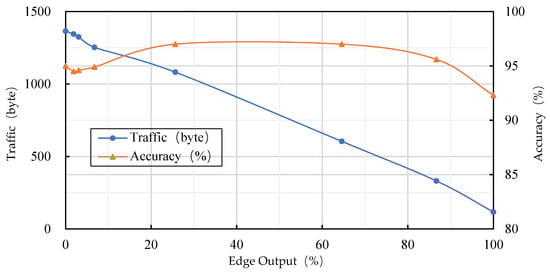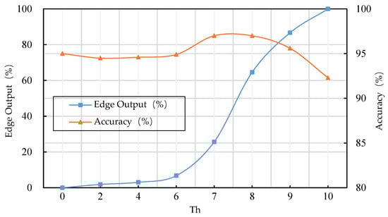 Samples were exited from the calculation at the edge and in the cloud in a certain proportion, and accuracy refers to the proportion of all samples that were correctly classified, as given by Equation (15). Equation (13) in Section 4.3.1 gives the confidence calculation method, which determines whether the sample exited the calculation at the edge layer from the result of the comparison between the confidence Confidence and the threshold Th. The edge output rate—i.e., the proportion of samples that dropped out of the calculation right at the edge layer, is given by Equation (16). As shown in Figure 11, when increasing the value of Th in turn, the proportion of samples that drop out of the calculation at the edge gradually increases, while the overall accuracy changes more smoothly, reaching a maximum in the range of 7–8 for Th.