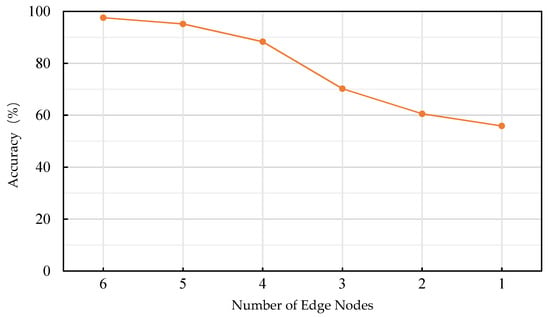 The impact of the number of edge nodes on the overall accuracy is an important aspect of evaluating C-AIBot. The state of individual nodes in a real botnet is not stable, so the random removal of edge nodes was chosen to simulate the real scenario. As shown in Figure 13, the accuracy decreased gradually as the edge nodes were removed sequentially, but the decreasing trend was not obvious in the first period, and the accuracy was still maintained at about 90% when two nodes were removed. The accuracy only started to show a significant downward trend when the number of nodes removed reached half. This indicates that the loss of a few nodes has a limited impact on the overall accuracy as long as most of the nodes are working properly.