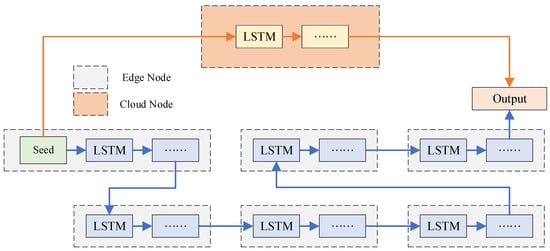 Phishing attacks are one of the main forms of botnet attacks. Spear-phishing attacks, on the other hand, are more targeted towards launching phishing attacks at specific targets. R-AIBot precisely exploits the advantages of RNNs in text generation for distributed automated spear phishing. First, the cloud node selects the attack target, and then it obtains the seed data locally at the target, followed by each node executing the intelligent computing text-generation task one after another. The experimental network was constructed as shown in Figure 14, consisting of six edge nodes and one cloud node in a distributed network architecture. The LSTM text generation model was deployed on each node, and the experimental dataset came from a publicly available corpus of tweets on the Internet [] containing tens of thousands of real tweets. The LSTM model requires serialized inputs and outputs; i.e., subsequent text generation requires generated text as input. Therefore, all output data from the previous node were sent to the next node until a complete tweet was generated at the final node. In order to simulate the situation of nodes using local data for model training online, this paper used different subsets of the dataset as training sets to train multiple LSTM models, respectively, and deploy them to the corresponding edge nodes. The LSTM in the experiments was set up with a segment length of 20 and a state vector dimension of 32. The experiments used a specified amount of computation for each node to simulate the performance difference among nodes in the real network, and the cloud nodes were allowed to complete the computation process of text generation independently as a comparison.