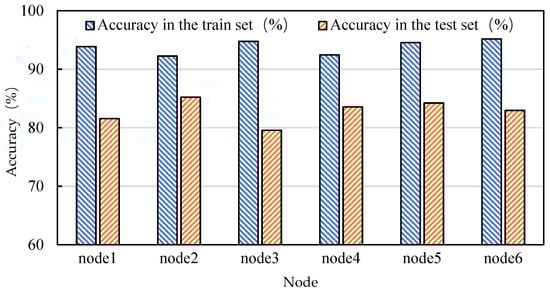The models deployed on each node were trained based on different subsets of data, so their validity had to be tested and verified first. A random sample of 20% from each data subset formed the test set for each node and the obtained results were compared with the accuracy of each node with their respective training sets. As shown in Figure 15, the LSTM models deployed on each node achieved high accuracy with their respective training sets, while their performances with the test set all declined but still managed to stay above 80%. In fact, methods such as increasing the number of neural network layers and adding a bidirectional LSTM can improve the performance of text generation models, but this is contrary to the principle of reducing the amount of node computation.