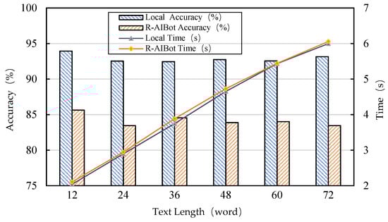 In the experimental validation of the multi-node text generation, the ratio of computation assigned to each node was 1:1:2:2:3:3 in order, while the LSTM model (obtained by training from the complete dataset) run independently by the cloud nodes was used as a comparison. The test set continued to use equal proportions of samples from each data subset, and the comparison experiment was repeated by adjusting the length of the generated tweets. The accuracy of R-AIBot was obtained from the weighted average of the accuracy of each node in proportion to the computation amount. As shown in Figure 16, R-AIBot did not perform as well as the local single-node-running LSTM model in terms of accuracy, but it could maintain a high level. The average time for tweet generation with R-AIBot gradually increased as the length of tweets increased, but there was no significant increase compared to the local LSTM model, so the delay due to inter-node communication was not significant.