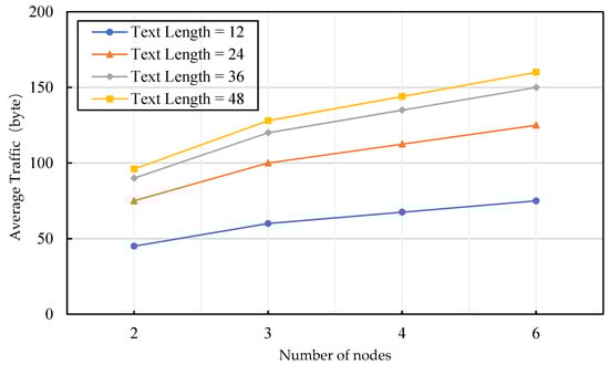 The communication traffic in R-AIBot due to node co-computation was an important aspect of the performance evaluation. In this paper, we set different numbers of nodes and text generation lengths for multiple replication experiments, recorded the relevant data and calculated the average traffic of the nodes. The average traffic was obtained by dividing the total traffic generated in the network by the number of nodes, as given by Equation (17). To avoid interference from other factors, the same amount of computation was specified for each node in the experiment. As shown in Figure 17, the longer the length of the text generated, the more nodes were involved in the text generation and the higher the average inter-node traffic generated. Therefore, selecting an appropriate length of text generated and assigning fewer nodes to participate in performing intelligent computations were effective means to reduce communication traffic in R-AIBot.