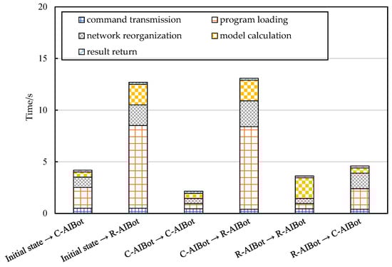 The results of the experiment are shown in Figure 18, where all subgroups were able to complete the assigned task within 15 s. The proportion of time spent on each of these items to the total time is shown in Table 2. Relatively speaking, program loading, network reorganization and model calculation accounted for a large proportion of the overall running time. Network reorganization took some time because different neural networks need the corresponding network organization to support distributed operations. The change of attack task led to a state switch in AIBot, thus requiring program update loading and network reorganization, and the execution time increased accordingly. R-AIBot took significantly longer than C-AIBot in both program loading and model computation because the LSTM model used in this paper was larger in size and computation than the CNN model. Overall, the running time of AIBot was as expected and the execution efficiency of C-AIBot was higher than that of R-AIBot.
