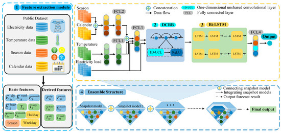 In this paper, we designed a flexible framework to forecast the short-term electricity load, as shown in Figure 1. In addition, its backbone is based on a DCRB and Bi-LSTM layer. At first, the input data are preprocessed to obtain the basic and derived features by the virtue of the feature extraction module. Specifically, the derived features comprise the average electricity features and temperatures. The temperature features are first concatenated and sent as input to two separate fully connected layers, with the second layer representing FCL1. The model also concatenates the calendar features and connects them with two fully connected layers. The second layer represents FCL2. Moreover, the model continues concatenating FCL1, FCL2, the actual temperature, and the electrical loads over one day. They are further connected with a separate fully connected layer denoted as FCL3, which is concatenated with other electricity load features. Then, the DCRB extracts the essential features from the above input data. The following Bi-LSTM layer can further capture the hidden temporal pattern. The forecasting value of one snapshot by a dense layer with is obtained with the linear activation function. In addition, the proposed model can construct multiple snapshots and ensemble them through ensemble thinking. The proposed framework produces the final forecasting result after averaging the snapshots’ outputs.