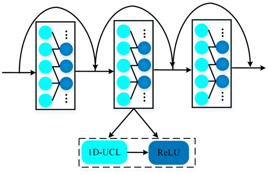 It is worth noting that the 1D-UCNN layer is introduced into the residual architecture to strengthen the generalization ability of the network. Specifically, the gradient information could back-propagate by adding the shortcut connections. Specifically, the hidden layer’s output is formulated as follows: