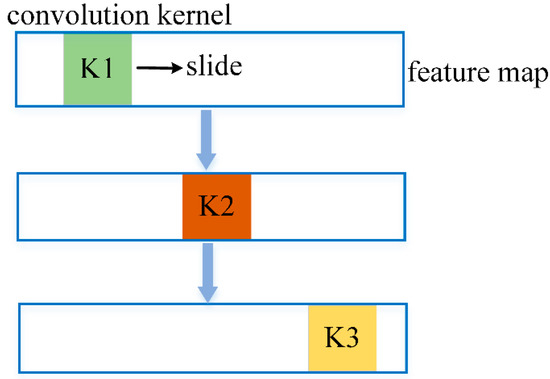 where denotes the training data, and is the corresponding value. The output of the model Θ () converges to after several training iterations. Θ () denotes the 1D-UCNN model. As shown in Figure 3, the region contained in the blue border denotes a feature map. Moreover, the squares represent the convolution kernels, which slide across the feature map to extract essential features. The three convolution kernels are marked in various colors, and they denote the different weight parameters. The feature extraction process of the hidden layer is expressed as follows: