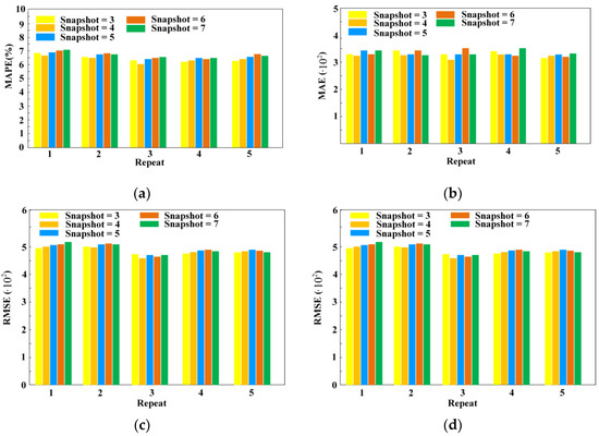 First, we tested the influence of different hyperparameters on forecasting accuracy. Concretely, the tuned hyperparameters were determined by the number of independent models and snapshots saved in a single training process. The performance comparison with the different number of snapshots is shown in Figure 4. It can be observed that the proposed ensemble framework provided the lowest forecasting error when the four snapshots were saved, respectively, during the training process of the three independent models.
