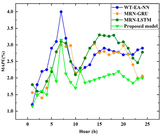 We further compared the forecasting results of the proposed method with other deep learning methods, such as WT-EA-NN [38], MRN-LSTM [41], and MRN-GRU [41]. MRN-LSTM [41] first adopts the load and temperature features as the input data of multiple fully connected layers. Then, the preliminary forecasted value is fed to the LSTM layer to obtain the final output. MRN-GRU [41] is carried out by combing multiple fully connected layers and a GRU layer. The forecasting results are shown in Figure 5 and Figure 6. At 1 a.m., the electricity loads concerning the previous 24 h of the method were the actual data. Thus, the proposed method produced the best forecasting results. At 7 a.m., the forecasting deviation reached the maximum, and the MAPE was 2.21. In addition, the proposed model could achieve more accurate one-day forecasting results, compared with the other models, for most months.