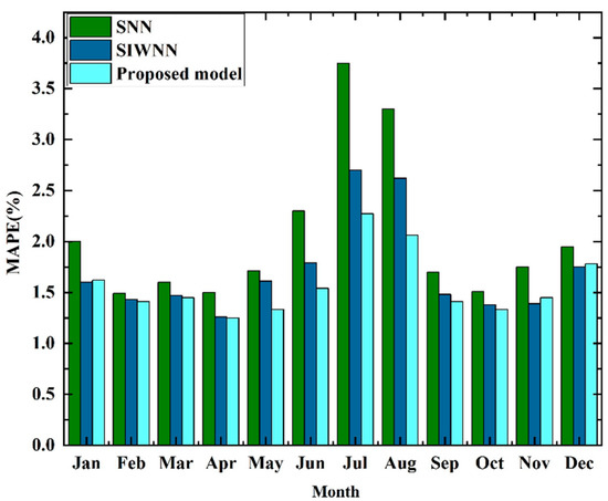 In the first case, we compared the proposed model with SNN [13] and SIWNN [13]. SNN [13] is implemented using a single neural network, which adopts the calendar information, electricity load, and temperature data as the input. In comparison, SIWNN [13] selects a similar day load as the input. Separate neural networks extract the load feature processed by wavelet decomposition. As shown in Figure 7, the proposed model could produce lower forecasting errors than the other models in most months over one year.
