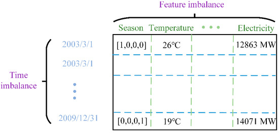 The presentation of input data batch: time imbalance, each row comprises the information at different timesteps; feature imbalance, each column comprises the different features, which can affect the forecasted load.