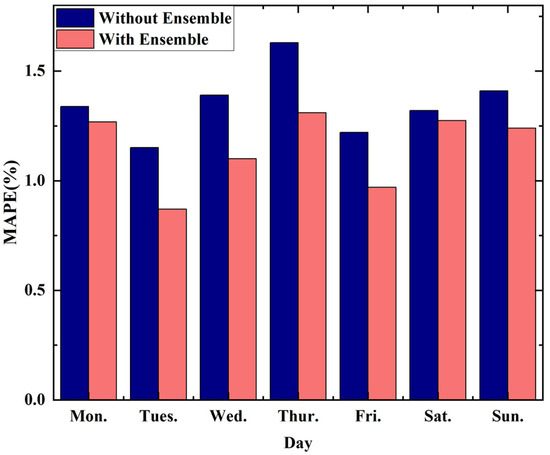 Comparison of the proposed method with ensemble thinking and the proposed method without ensemble thinking on individual days: MAPE, mean absolute percentage error.