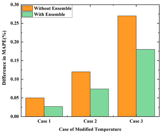 As we adopted the actual temperature data as the model input, the forecasting results show the estimated upper bound of the forecasting performance. It is essential to analyze the forecasting accuracy of the proposed model when the forecasted temperature was adopted, and whether ensemble thinking can help the model produce more robust results in noisy temperature conditions. Thus, we adopted the method of modifying the temperature data proposed in [36] and designed three cases to verify the generalization ability of the proposed method. We repeated the experiments 5 times and obtained the means of increased MAPE and computation time.