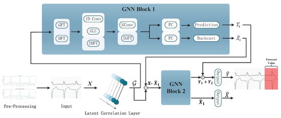The above is the operation mechanism of GNN block 1. Furthermore, block 2 tries to input the residual error between the detected values obtained by block 1 and the historical real value to get a more accurate predicted value. It is worth noting that block 2 no longer outputs the recast branch, so the final output is the predicted value of the ECG sequence that we need.