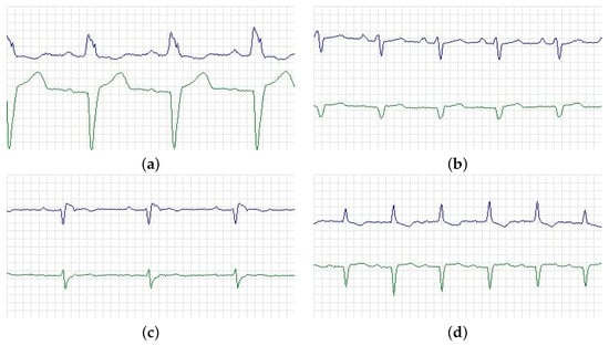 The hardware environment of this paper is AMD Ryzen 7.5800 H processor, and the software environment is developed based on Python3.7 Pytorch open source framework. The open dataset, i.e., BIDMC Congestive Heart Failure (BIDMC-CHF) database is used in this study, which includes long-term electrocardiograms of 15 patients (11 males aged 22 to 71 and 4 females aged 54 to 63). The individual recordings are each about 20 hours in duration and contain two ECG signals. Each sample at a rate of 250 samples per second with 12-bit resolution over a range of ±10 millivolts [26]. In addition, each ECG recording contains around 17 million sample intervals. The part of ECG is shown in Figure 3, where the blue one stands for lead V1 and the green one for V2. Specifically, (a) is from a 71-year-old male and belonged to the left bundle branch block beat (class N in AAMI standard). (b) is from a 61-year-old female, and the ECG showed that one P wave was followed by two QRS waves, which belonged to class S in the AAMI standard. (c) is from a 51-year-old male, this patient had sinus bradycardia at the time of recording, which also belonged to class S. Furthermore, (d) is from a 22-year-old male and belonged to P-mitrale (class S in AAMI standard). The NYHA class of all the patients is III–IV.
