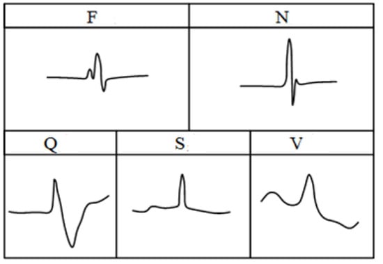 For the classification and diagnosis of arrhythmia, one of the main difficulties is that each people has a unique heartbeat waveform, which is different from others, and the ECG of different arrhythmia diseases varies greatly, so it is vital to classify the heartbeat between different individuals. For this purpose, the association for the advancement of medical instrumentation (AAMI) proposed a standard to evaluate the performance of algorithms. The heartbeat category was divided into five types, i.e., non-ectopic (N), supraventricular ectopic (S), ventricular ectopic (V), fusion (F) and unclassified heartbeat (Q). The details of heartbeat classification were shown in Table 1. In addition, the five types of ECG waveform characteristics of a heartbeat can be roughly represented in Figure 4.