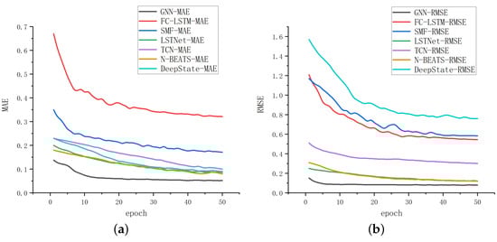 We compared the iteration rate and results of the above methods by setting the iteration time as 50, and the results are displayed in Figure 5. According to Table 2 and Figure 5, it can be seen that the method proposed in this paper has significant advantages in both convergence results and rates. The final fitting result of GNN is better than other methods, and it is more accurate for multi-channel time-series prediction.