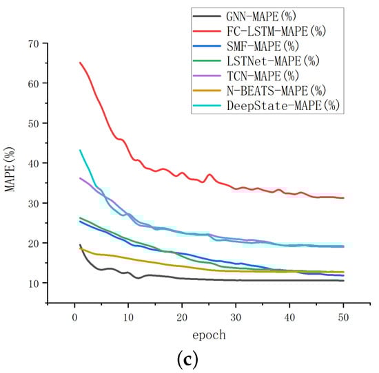 Iterative comparison. (a) is the result under MAE; (b) is the result under RMSE; (c) is the result under MAPE.