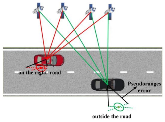 Biased localization can be caused by the influence of pseudoranges error. As shown in Figure 1, due to the pseudoranges error, the position of the black vehicle is not located in its lane, and the red vehicle is in its lane but not in an exact location.
