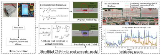 In order to improve the positioning accuracy, an improved CMM method that applies map road constraints is proposed to improve the positioning accuracy. A receiver is fixed on the vehicle to obtain the initial measurement position. The received data from GPS are WGS-84 coordinate data which are expressed in latitude and longitude. In general, it is usually used to adopt two-dimensional plane Cartesian coordinate data. Therefore, it is necessary to convert the latitude and longitude data into plane coordinates. To obtain the plane coordinate data, we adopt the Gauss-Kruger projection method. The plane coordinate data are obtained by projecting the China Geodetic Coordinate System 2000 (CGCS2000) reference system.