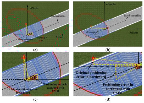 Figure 3 reveals the principle of the CMM method applying the road constraint model. When applying the road constraint model for map matching, the road constraints are mainly used to correct the positioning error in the direction perpendicular to the line, and there are no constraints in the direction parallel to the line. Therefore, the proposed CMM method may not improve the error effectively or even increase the error in the sub-direction, but there is an effective improvement in the overall error. Figure 3a, b, respectively, present the effect of the CMM method applying the road constraint model in different sub-directions.