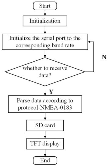 The software of the designed system analyzes the positioning data of the ATK1218-BD/GPS through the STM32 master controller, saves these data to SD card, and displays real-time positioning information through the thin film transistor (TFT) display. The algorithm process of the software is provided in Figure 5.