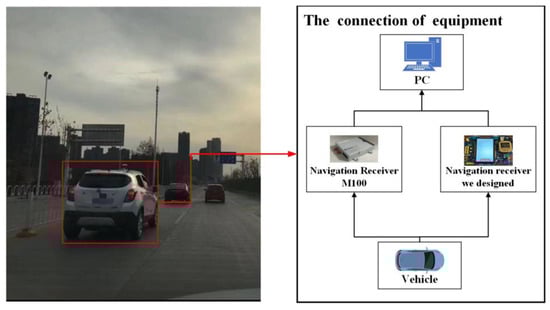 Based on the above theoretical analysis, we designed and performed a real experiment. The experimental equipment included the positioning system designed in the previous section, a Sinan M100 receiver and a computer. The GNSS antenna was mounted on top of the vehicle. The data collected by the positioning system were stored in the SD card and the data collected by the M100 receiver is stored in the computer. The M100 receiver can reach a centimeter-level accuracy in RTK positioning. Its performance parameters are shown in Table 2. Figure 6 is the connection of the test equipment.