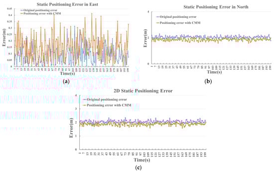 From the experimental results, the MAE of 2D static positioning error is 2.048 m, which is reduced to 1.863 m through CMM correcting. As shown in Figure 7c, throughout the static experiment, the 2D positioning error with CMM correction is stable at around 1.86 m. Moreover, compared with the original 2D positioning, the overall RMSE is reduced by 4.9%. It can be found from Figure 7b that there is a significant reduction in northward error. The MAE of northward positioning is 2.033 m, which is reduced to 1.854 m. As shown in Figure 7a, the MAE is increased from 0.089 m to 0.151 m in eastward error. Figure 8 shows the positioning results of the static experiment, which is consistent with the analysis in Figure 3a.