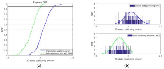 The performance of the CMM method is further evaluated by cumulative distribution function (CDF) and probability density function (PDF) of the positioning error. CDF describes the probability that a random variable falls within a certain range, while PDF describes the probability that the random error output value is near a certain point [32]. The CDF and PDF of static experimental results are shown in Figure 9.
